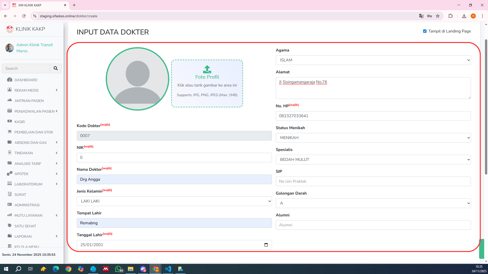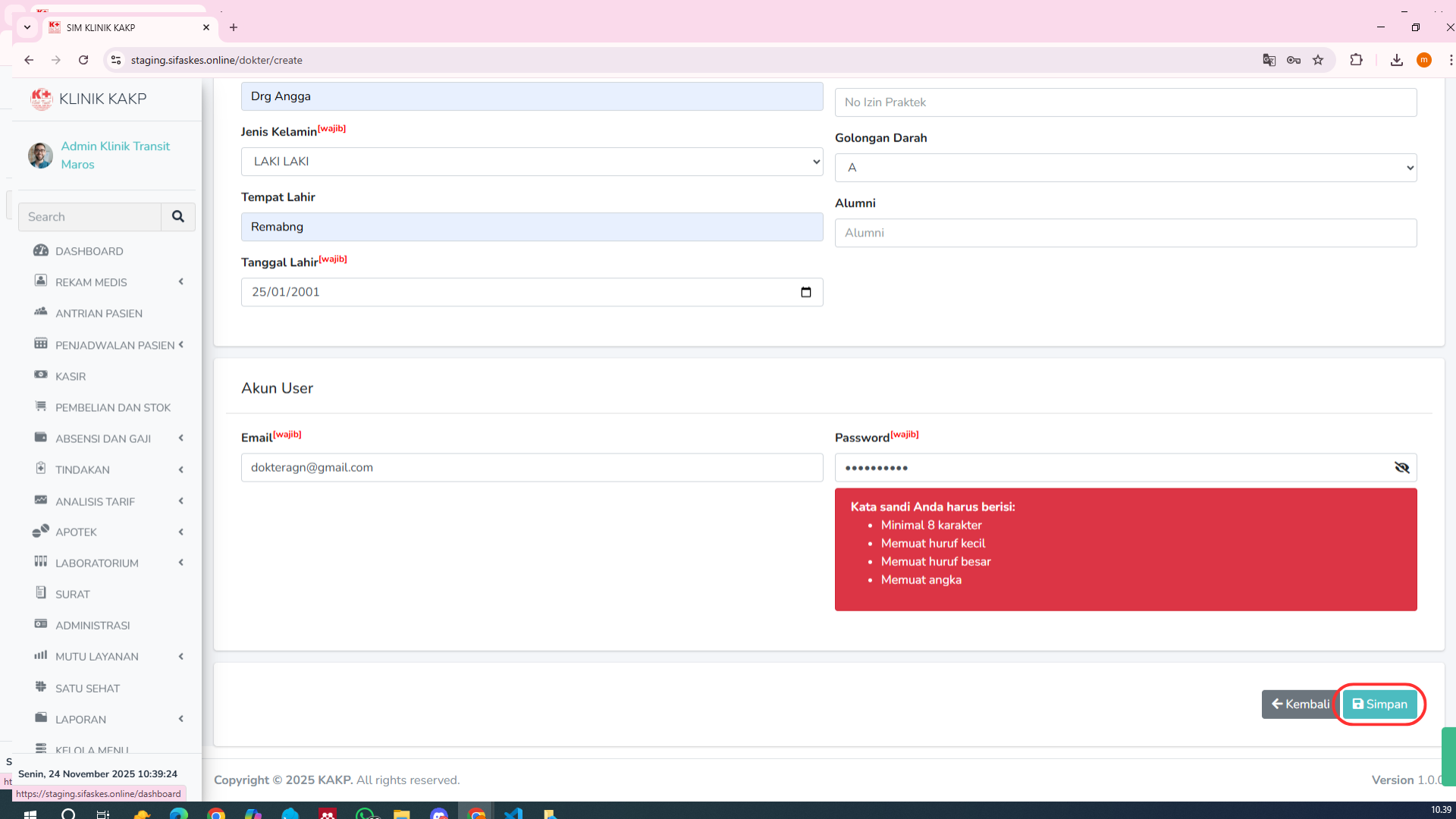 Setelah semua data diisi, klik tombol Simpan untuk menyimpan data dokter baru