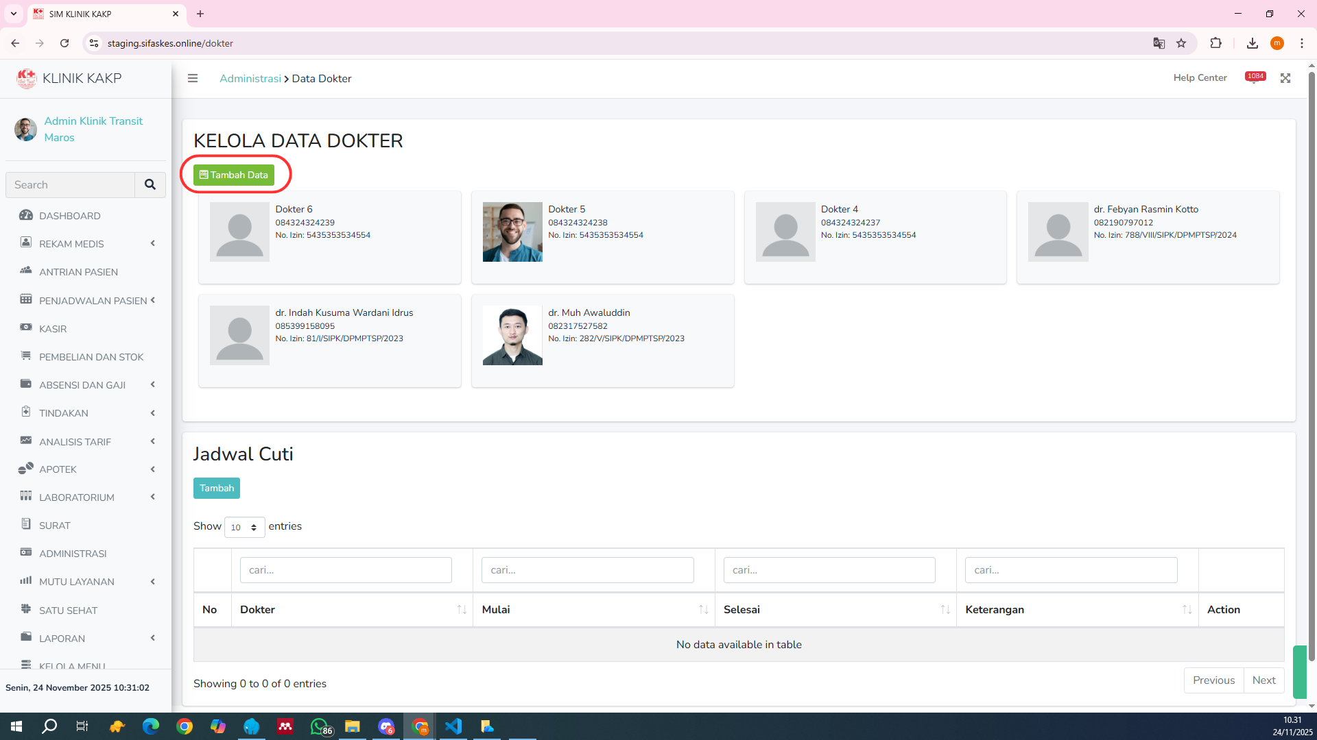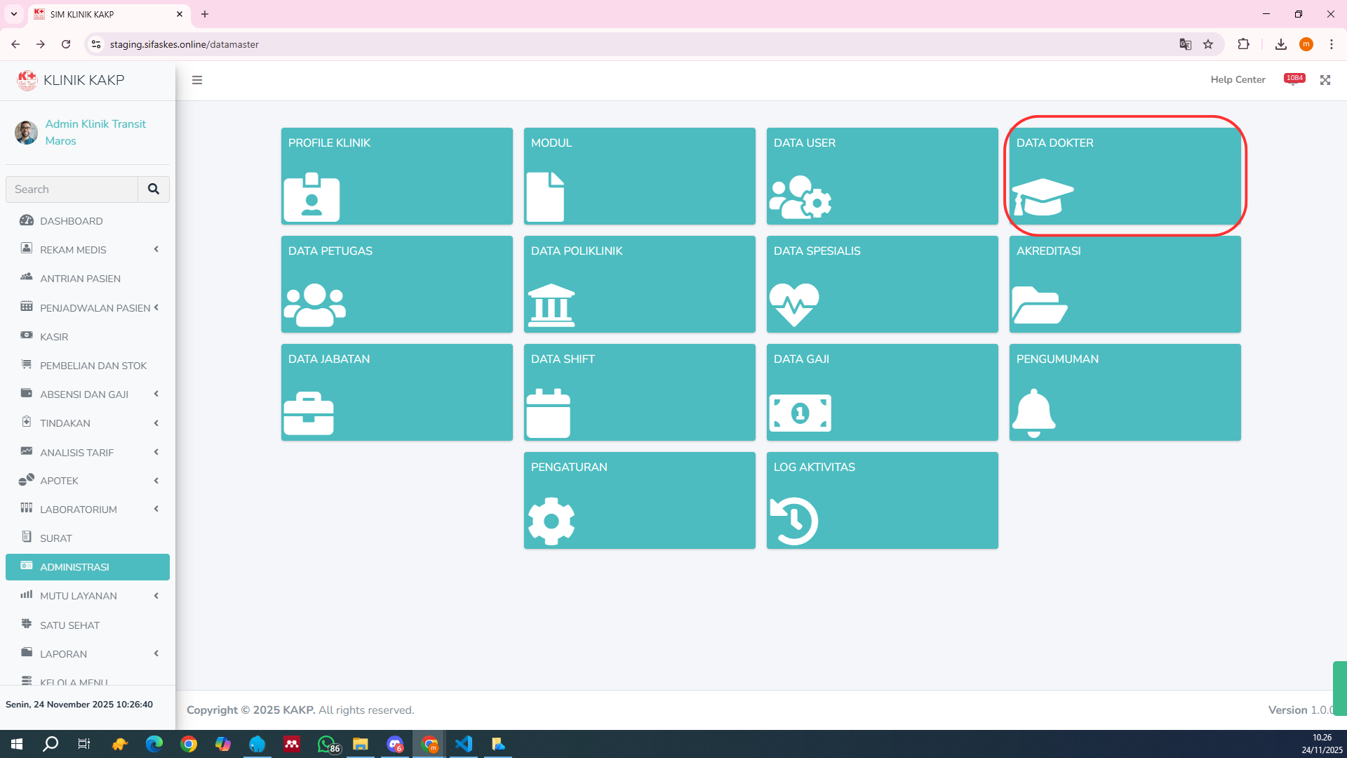 Cari dan klik menu Data Dokter di halaman Administrasi