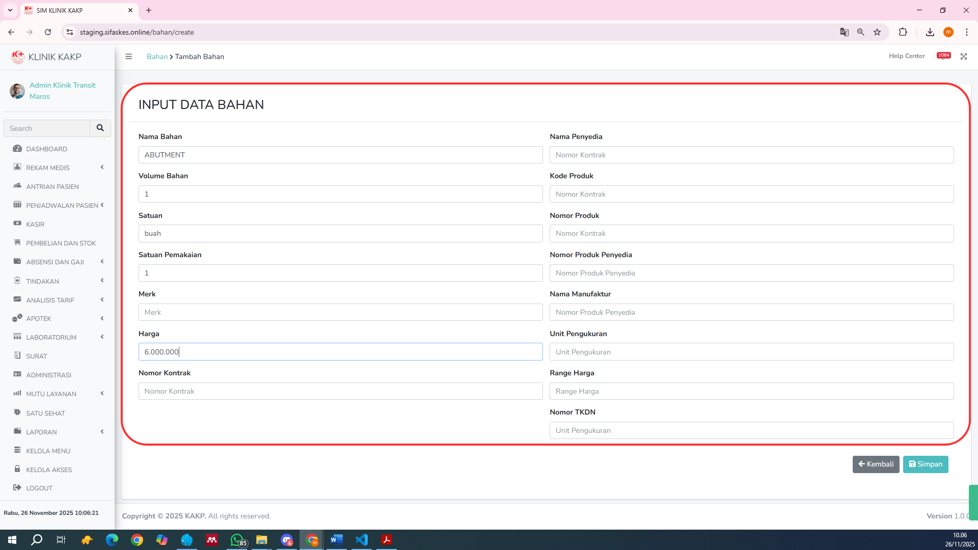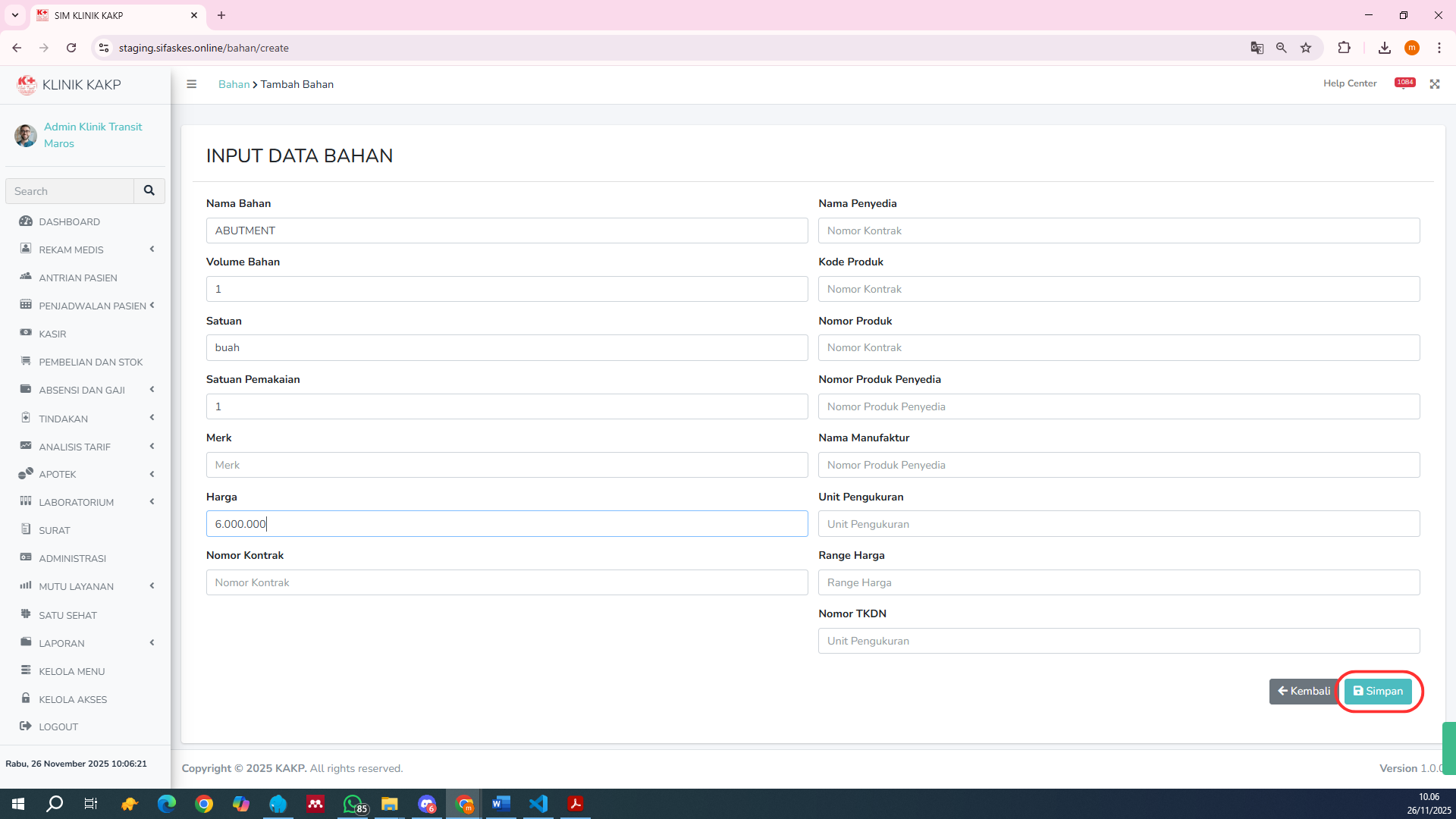 Klik tombol Simpan untuk menyimpan data bahan baru