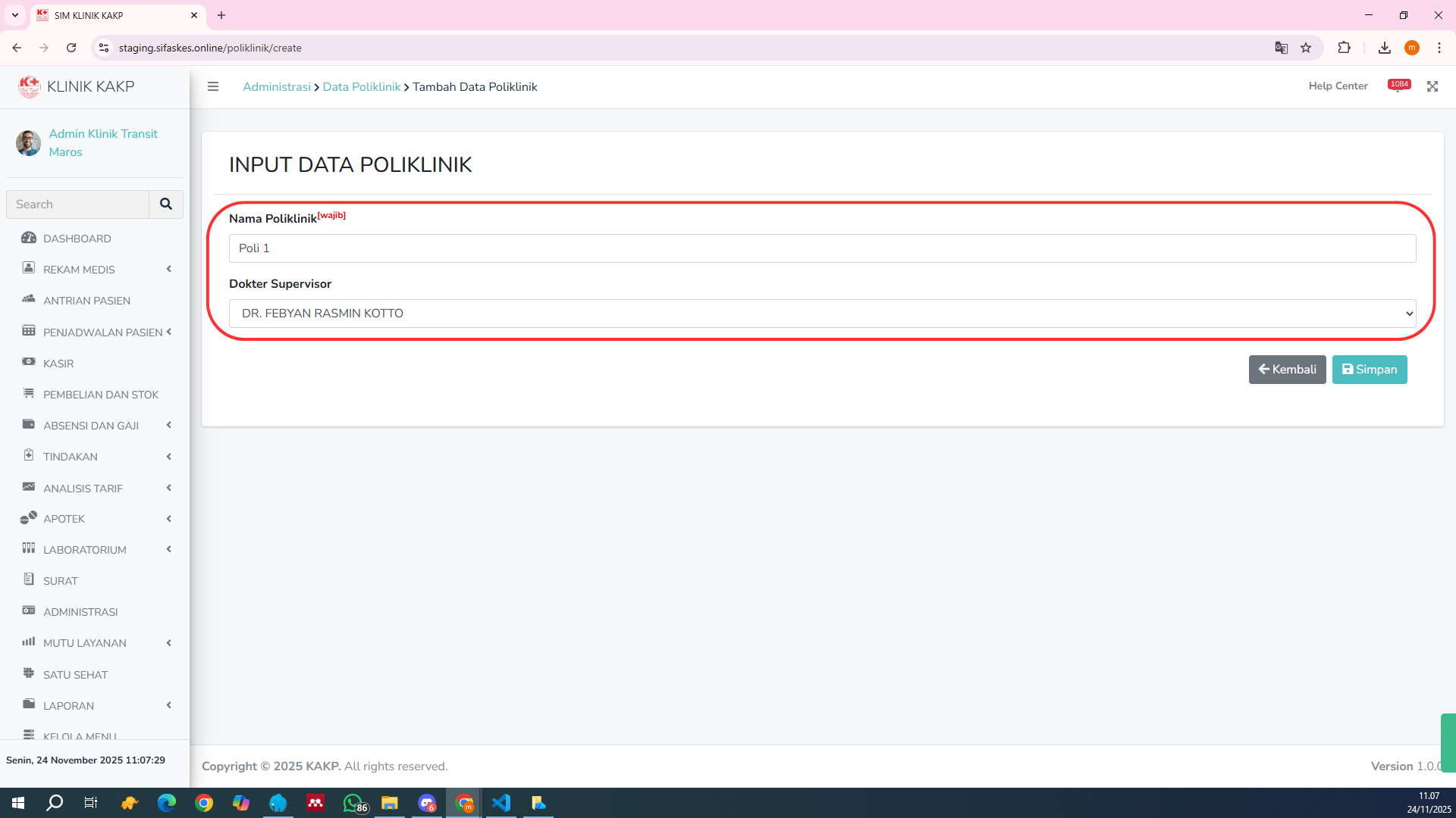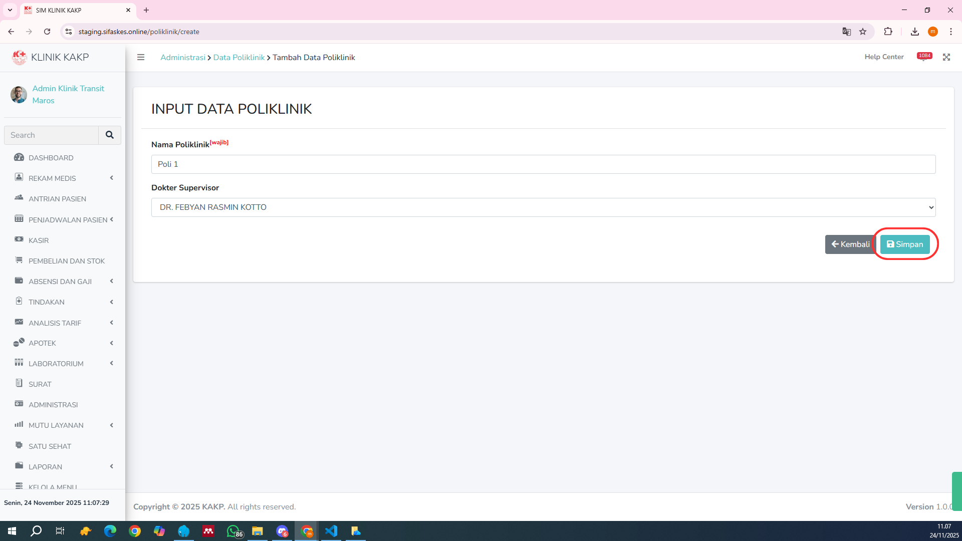 Klik tombol Simpan untuk menyimpan poliklinik baru