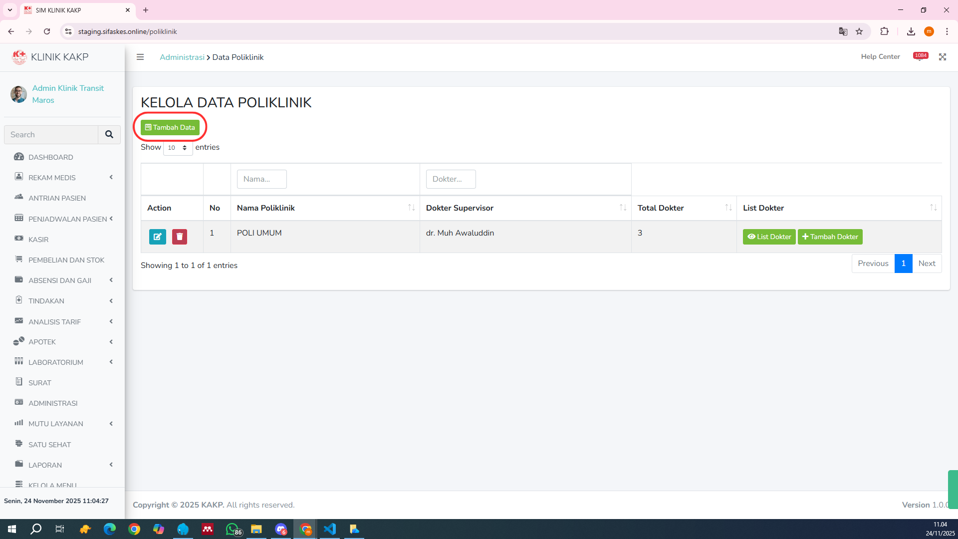 Temukan dan klik tombol Tambah Data untuk membuat poliklinik baru