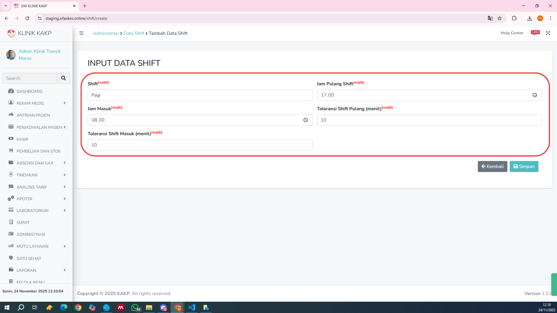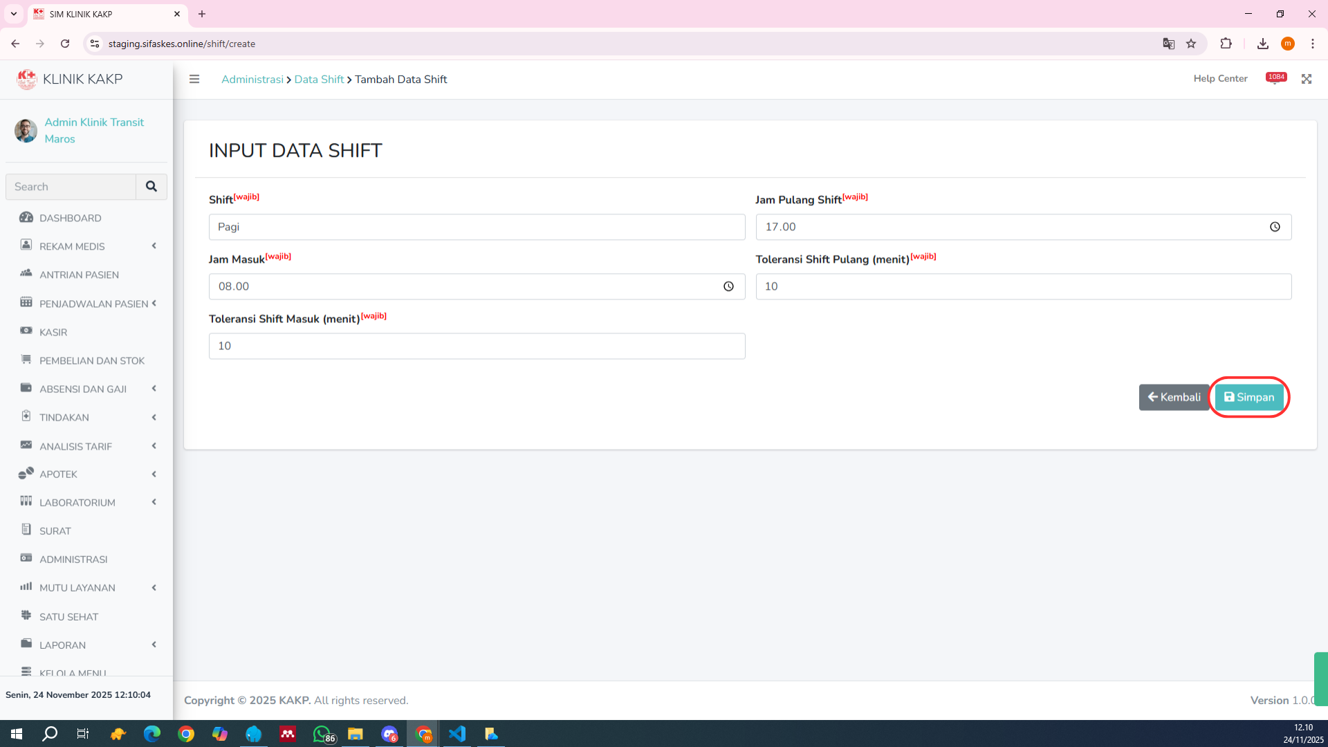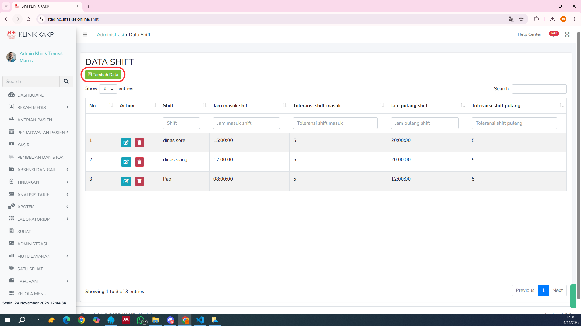 Temukan dan klik tombol Tambah Data untuk membuat shift baru