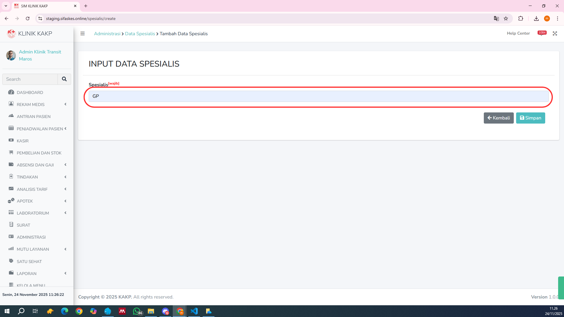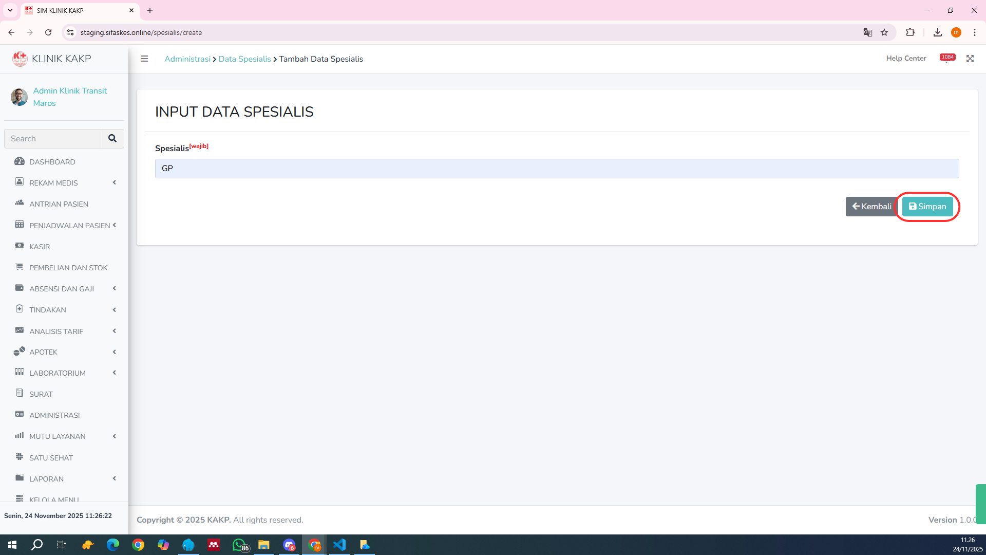 Klik tombol Simpan untuk menyimpan spesialis baru