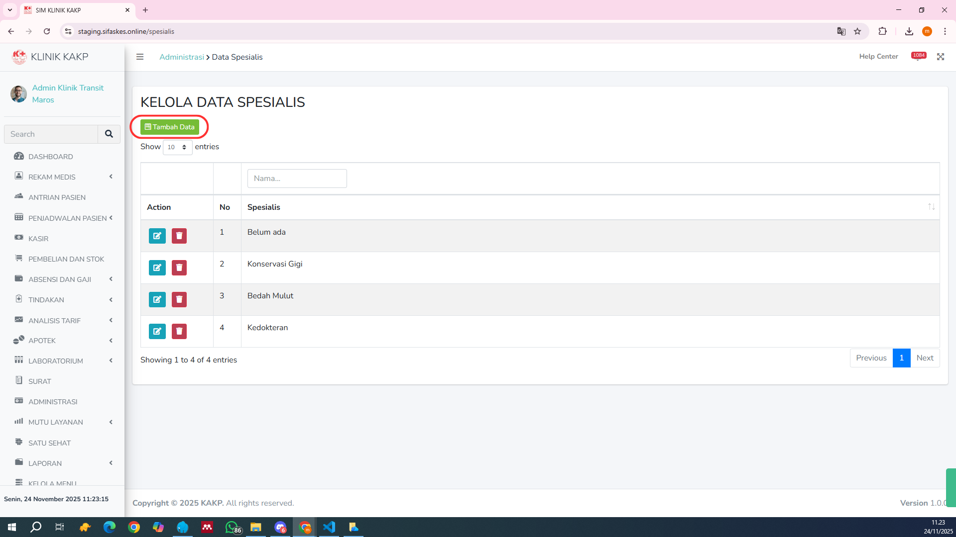 Temukan dan klik tombol Tambah Data untuk membuat spesialis baru