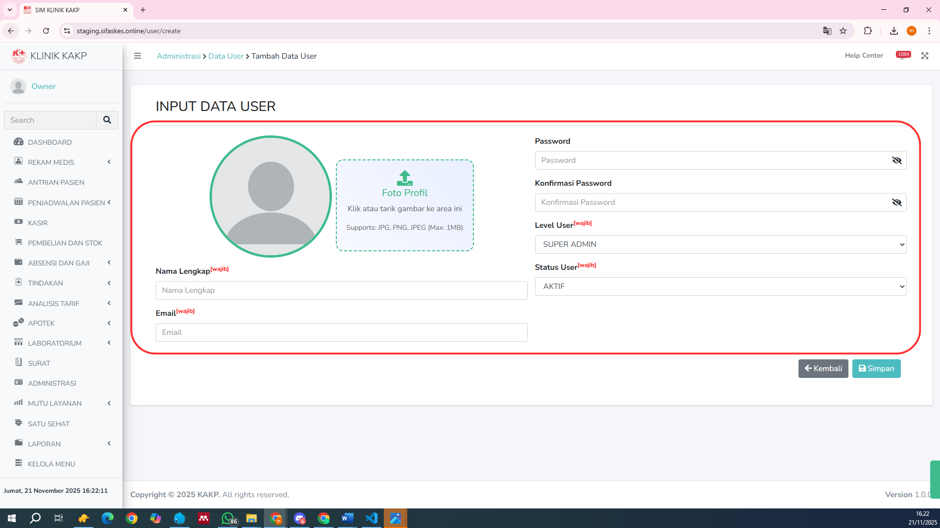 Unggah foto pengguna jika tersedia. Tidak wajib diisi, tetapi dapat membantu identifikasi pengguna secara visual.