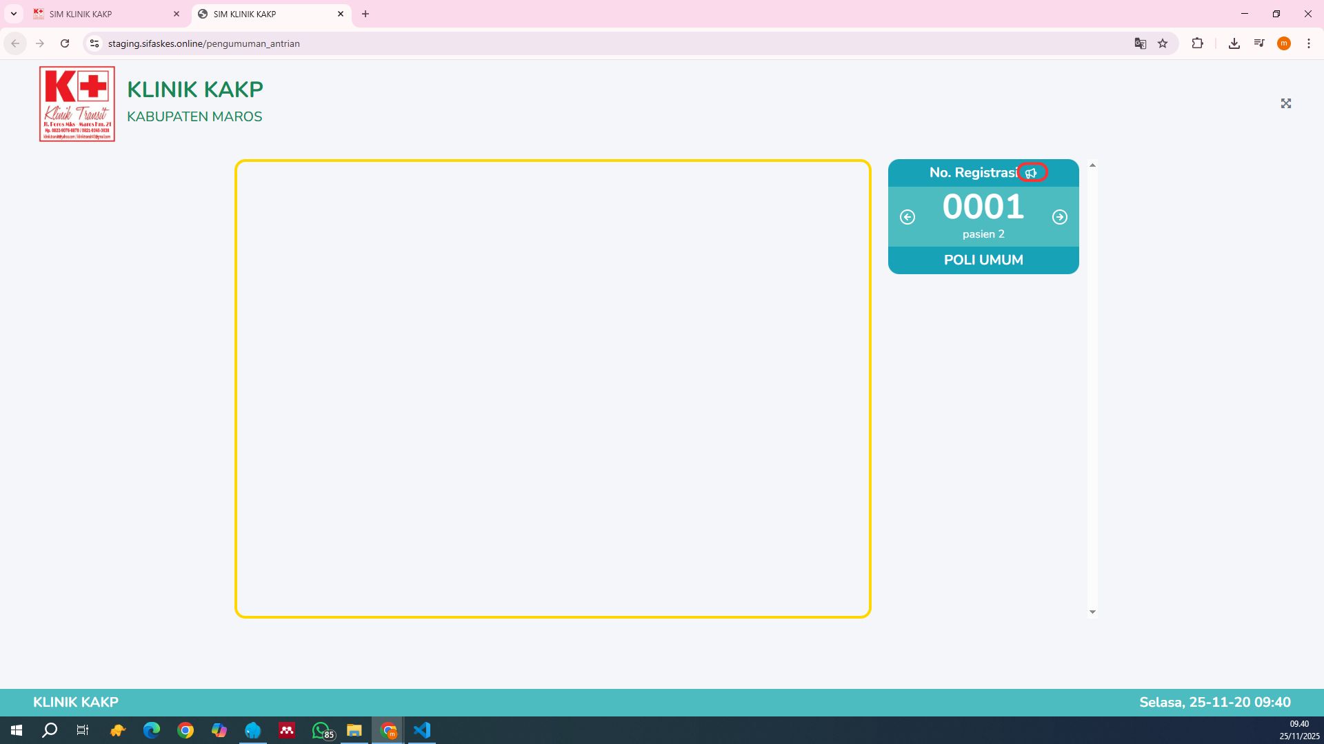 Setelah daftar antrian muncul, klik ikon speaker untuk memanggil pasien