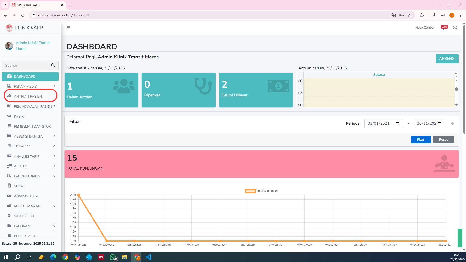 Akses menu Antrian Pasien melalui sidebar navigasi aplikasi