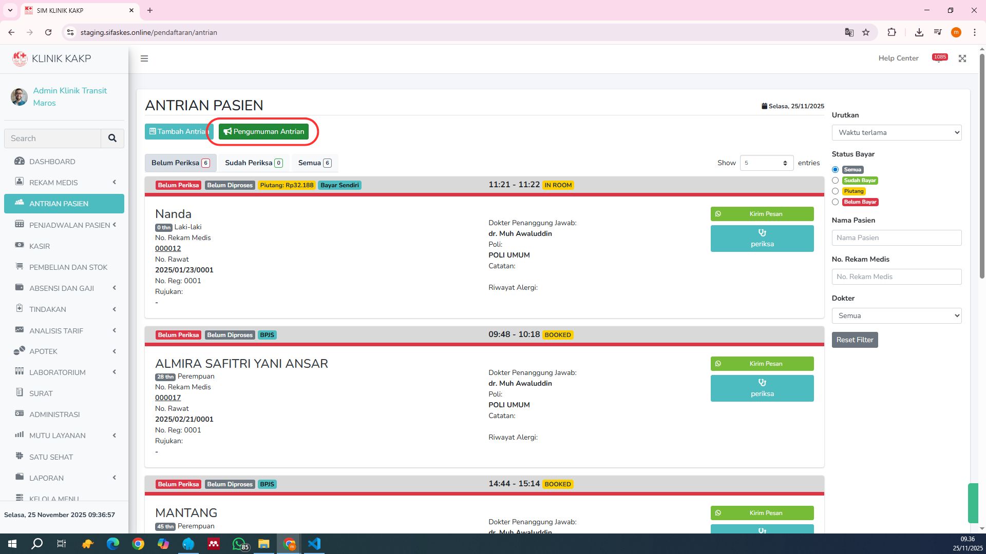 Temukan dan klik tombol Pengumuman Antrian pada halaman Antrian Pasien