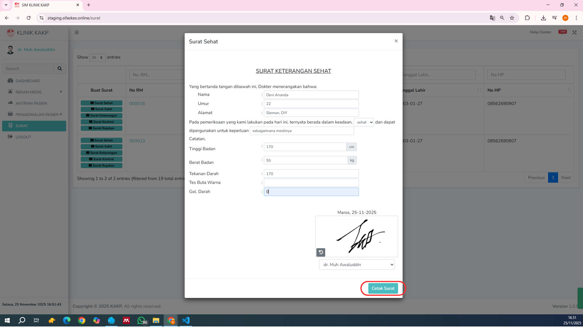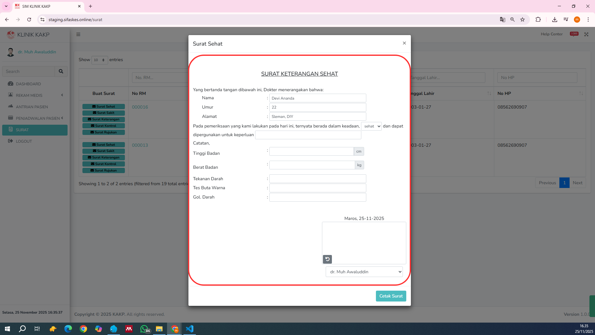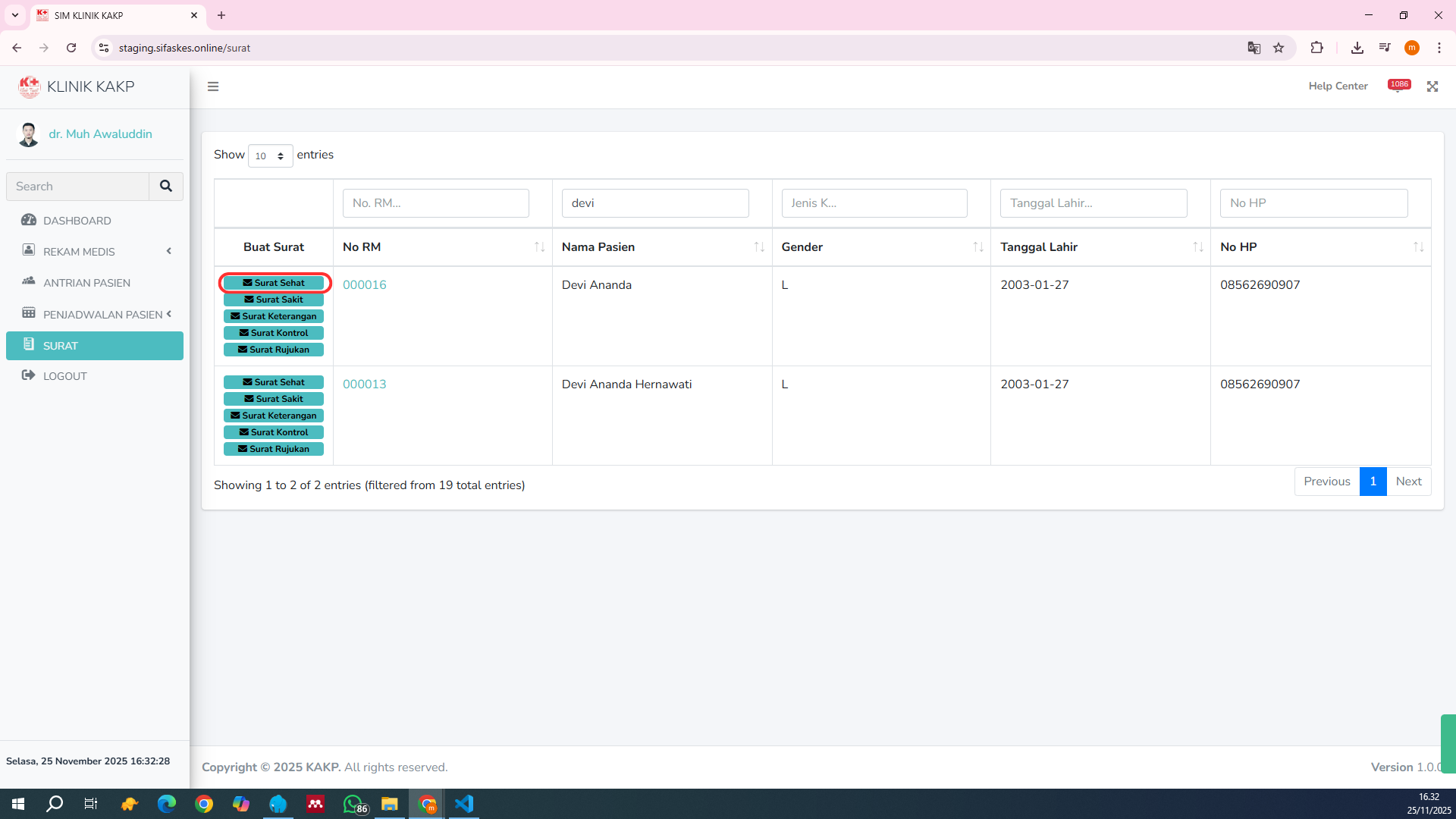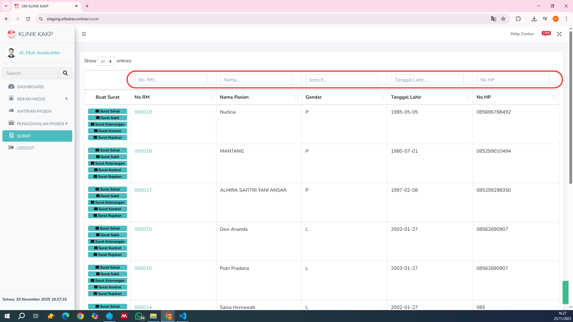 Gunakan fitur filter untuk menemukan pasien yang akan dibuatkan surat