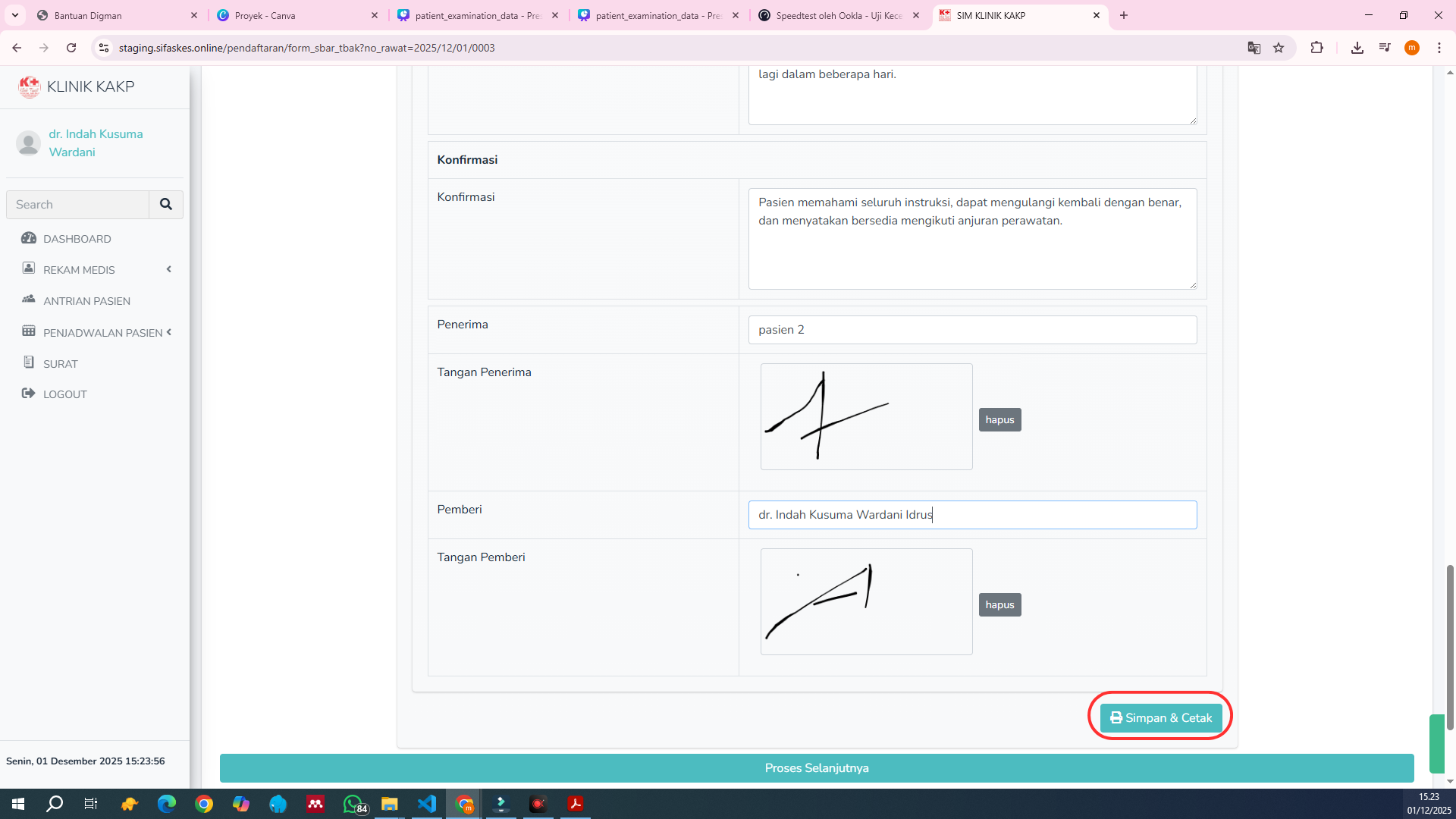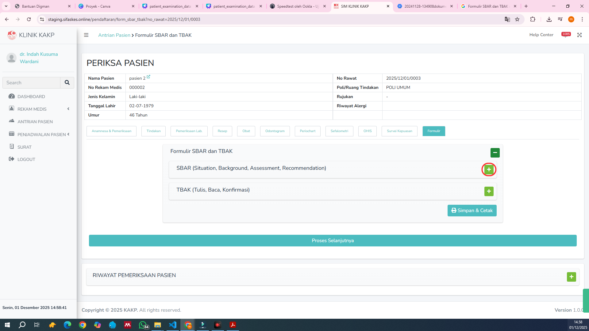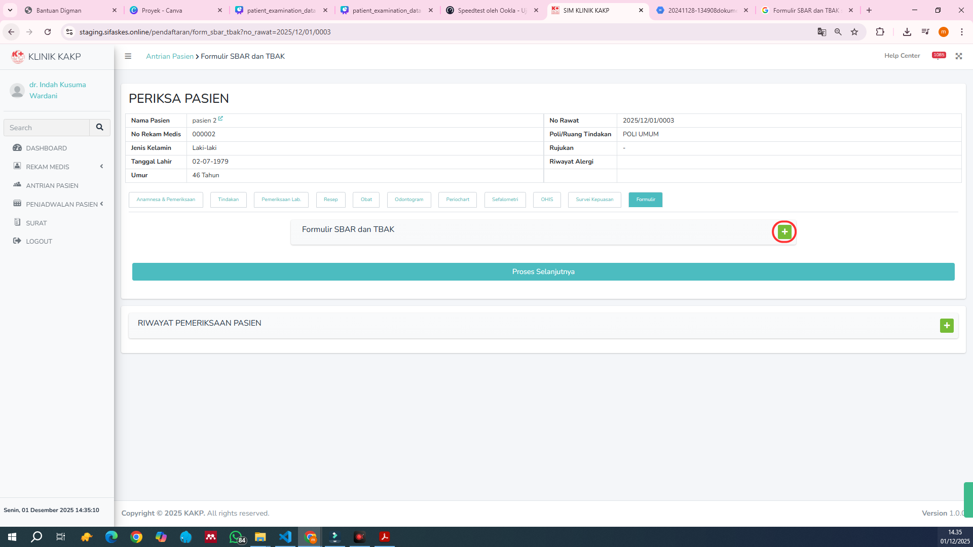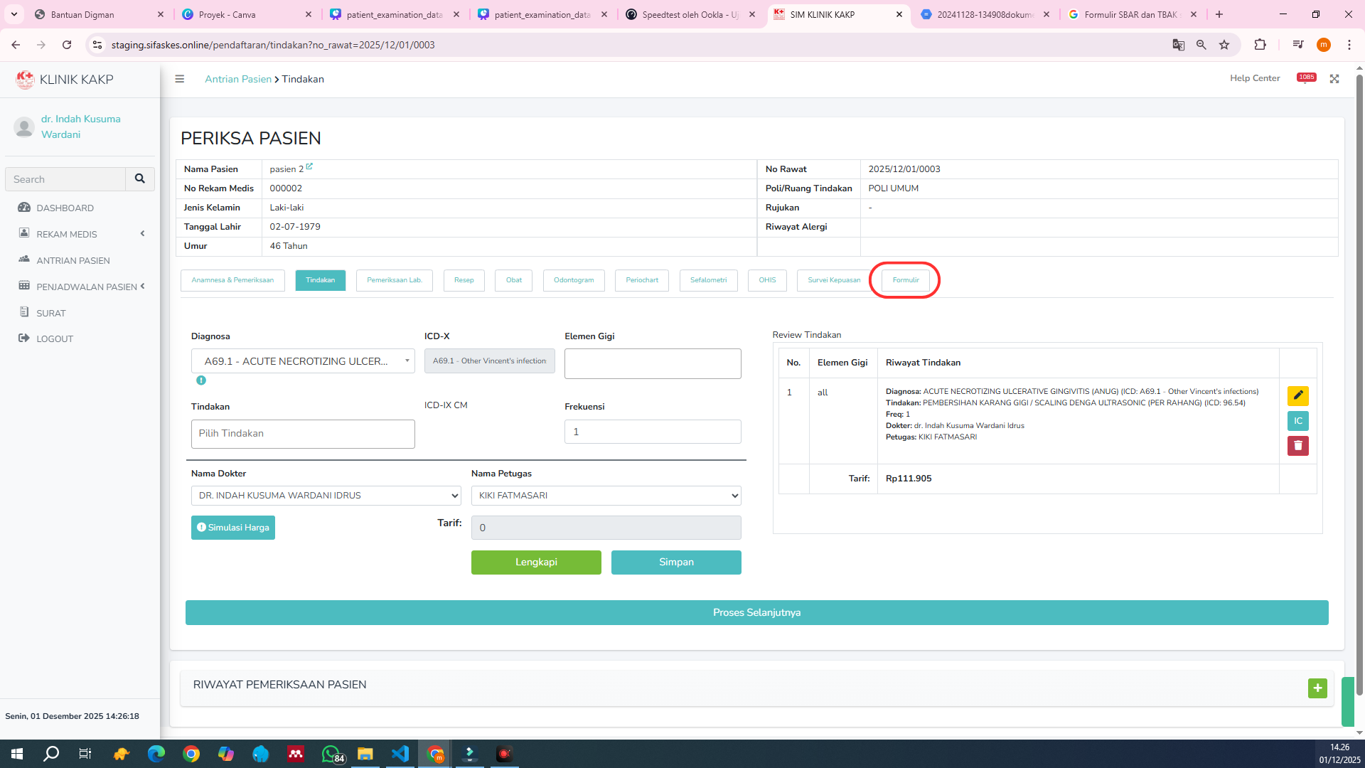 Setelah data anamnesa, pemeriksaan, dan tindakan terisi, pilih tab formulir