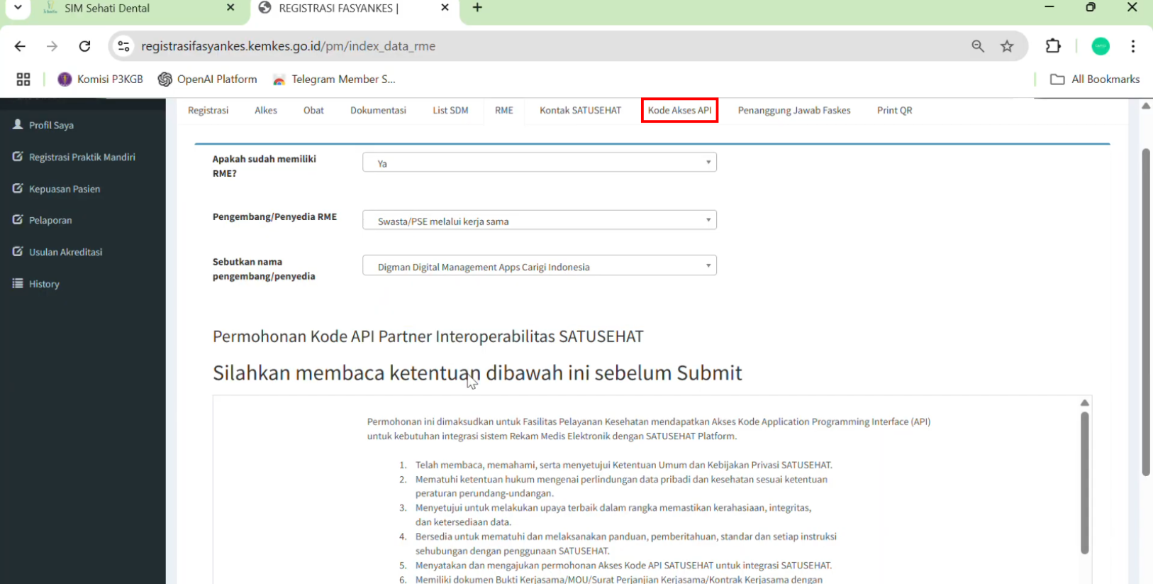 Kode akses akan tersedia di menu 'Kode Akses API' dalam waktu 3–7 hari kerja setelah pengajuan berhasil.