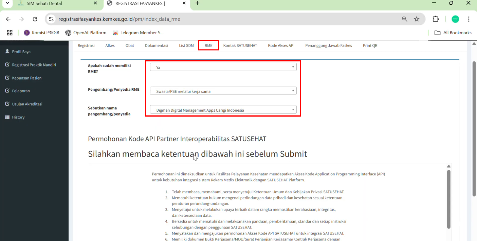 Pastikan Anda memasukkan informasi RME yang digunakan.