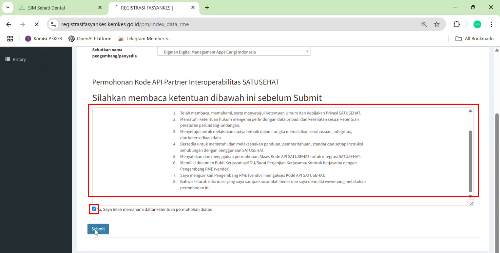 Baca seluruh ketentuan permohonan, lalu beri tanda centang pada pernyataan bahwa Anda telah memahami semua isi dokumen.