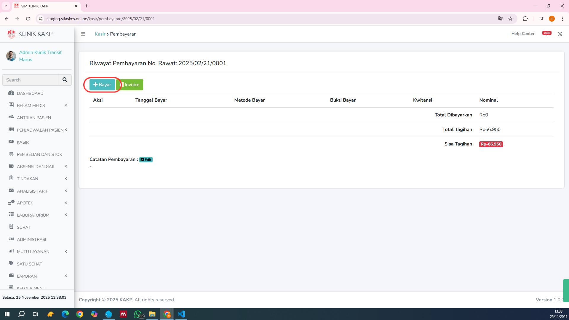 Sistem akan menampilkan detail tagihan pasien. Klik tombol Bayar untuk melanjutkan proses