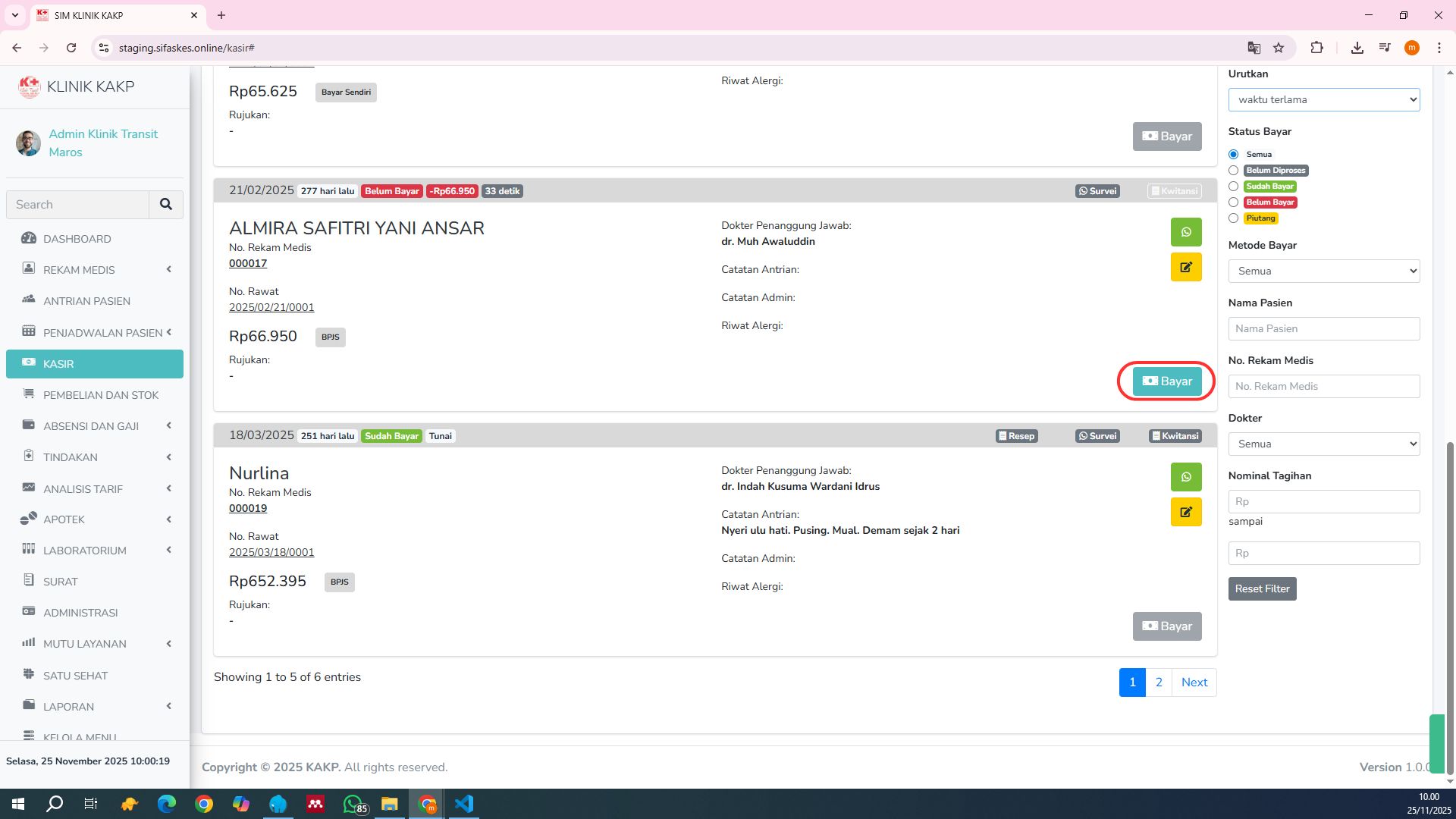 Pilih pasien yang ingin diproses pembayarannya dari daftar pasien di menu Kasir