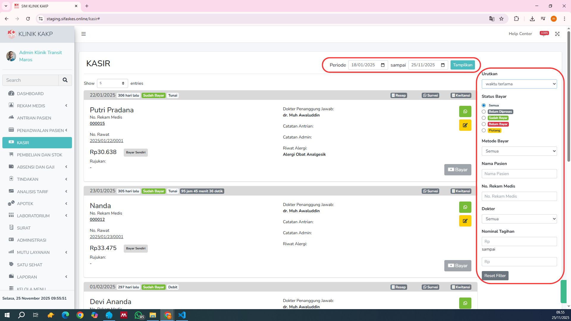 Manfaatkan fitur pencarian atau filter untuk menemukan pasien yang akan dibayar tagihannya