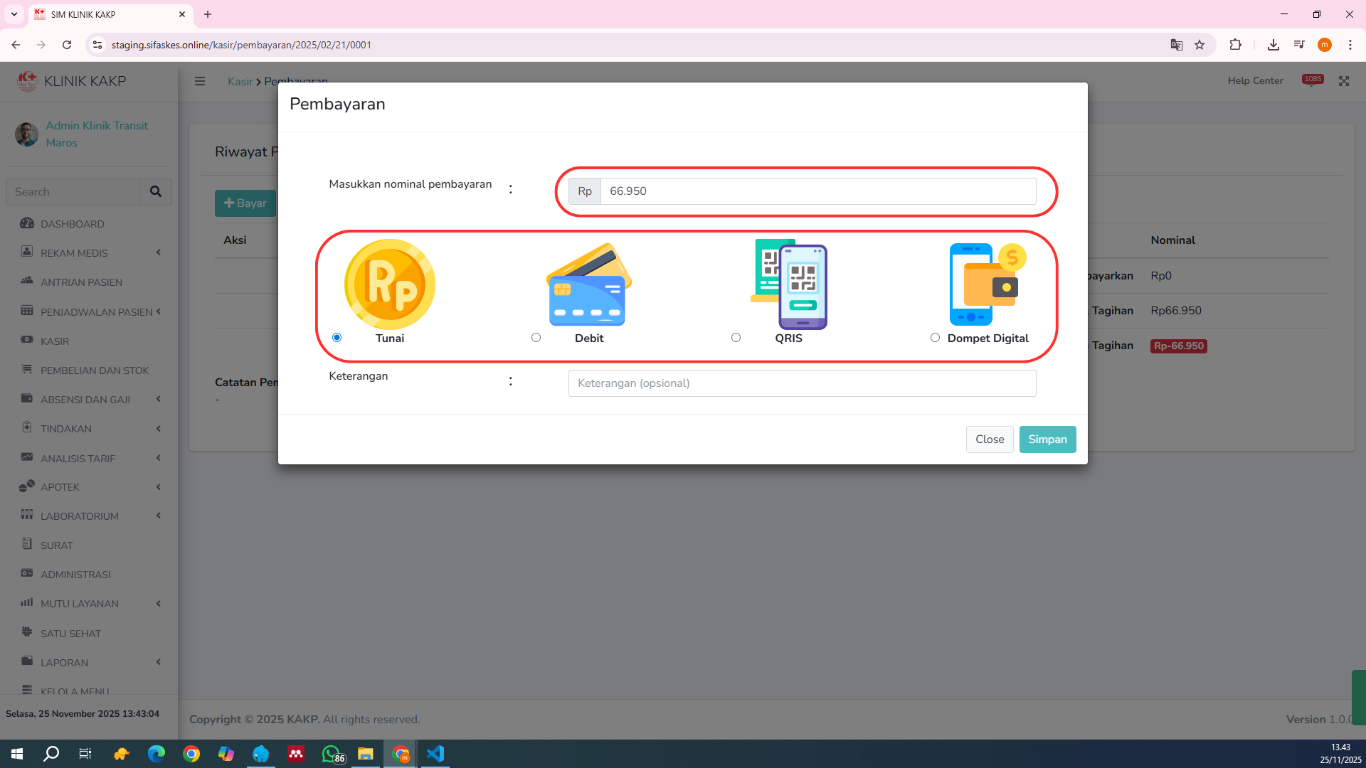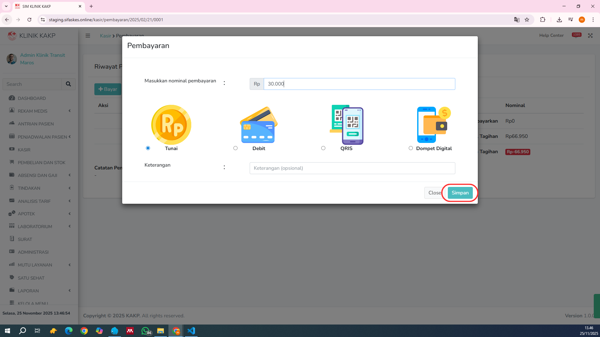 Klik tombol Simpan untuk menyimpan pembayaran pasien
