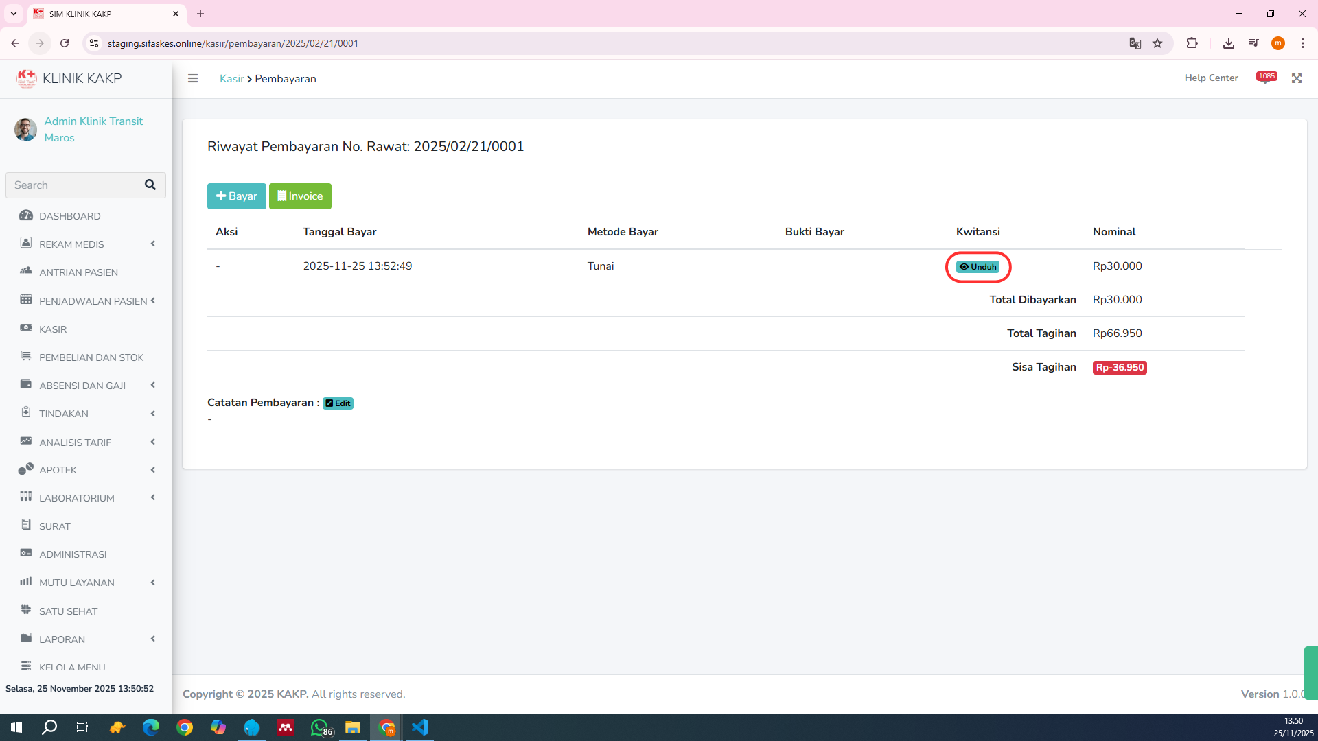 Jika pasien sudah pernah melakukan pembayaran, rincian akan ditampilkan