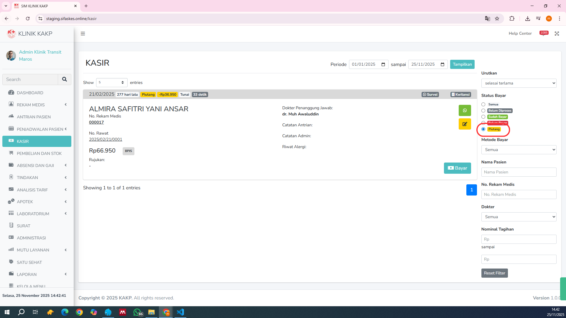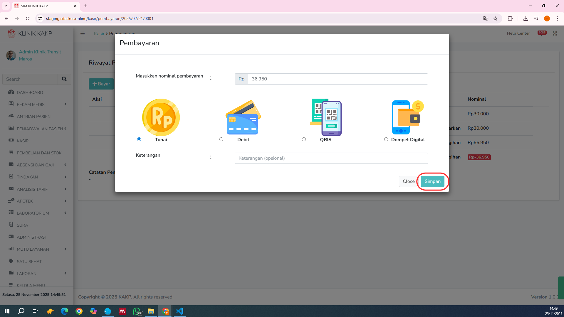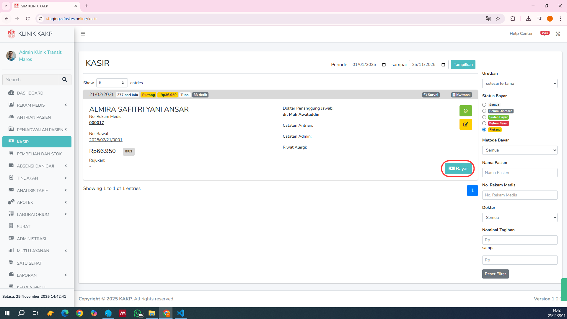 Temukan dan klik tombol Bayar pada data pasien yang dipilih