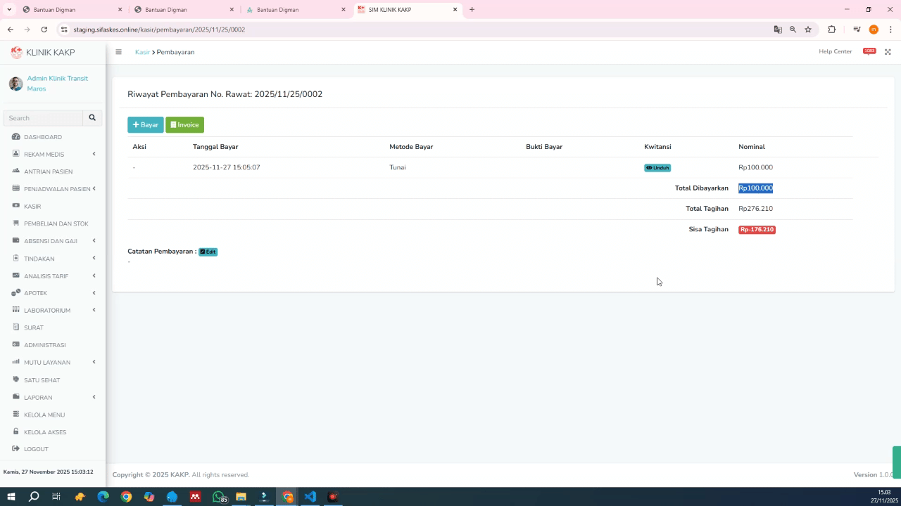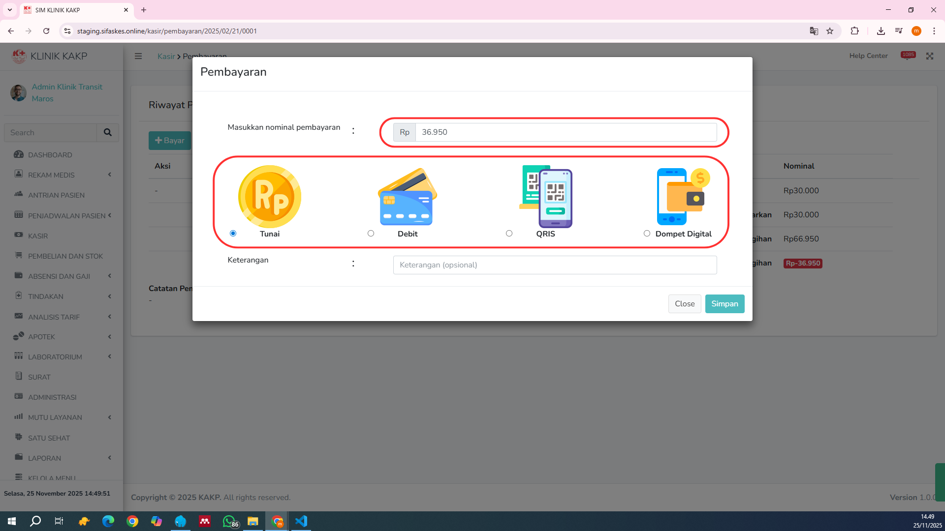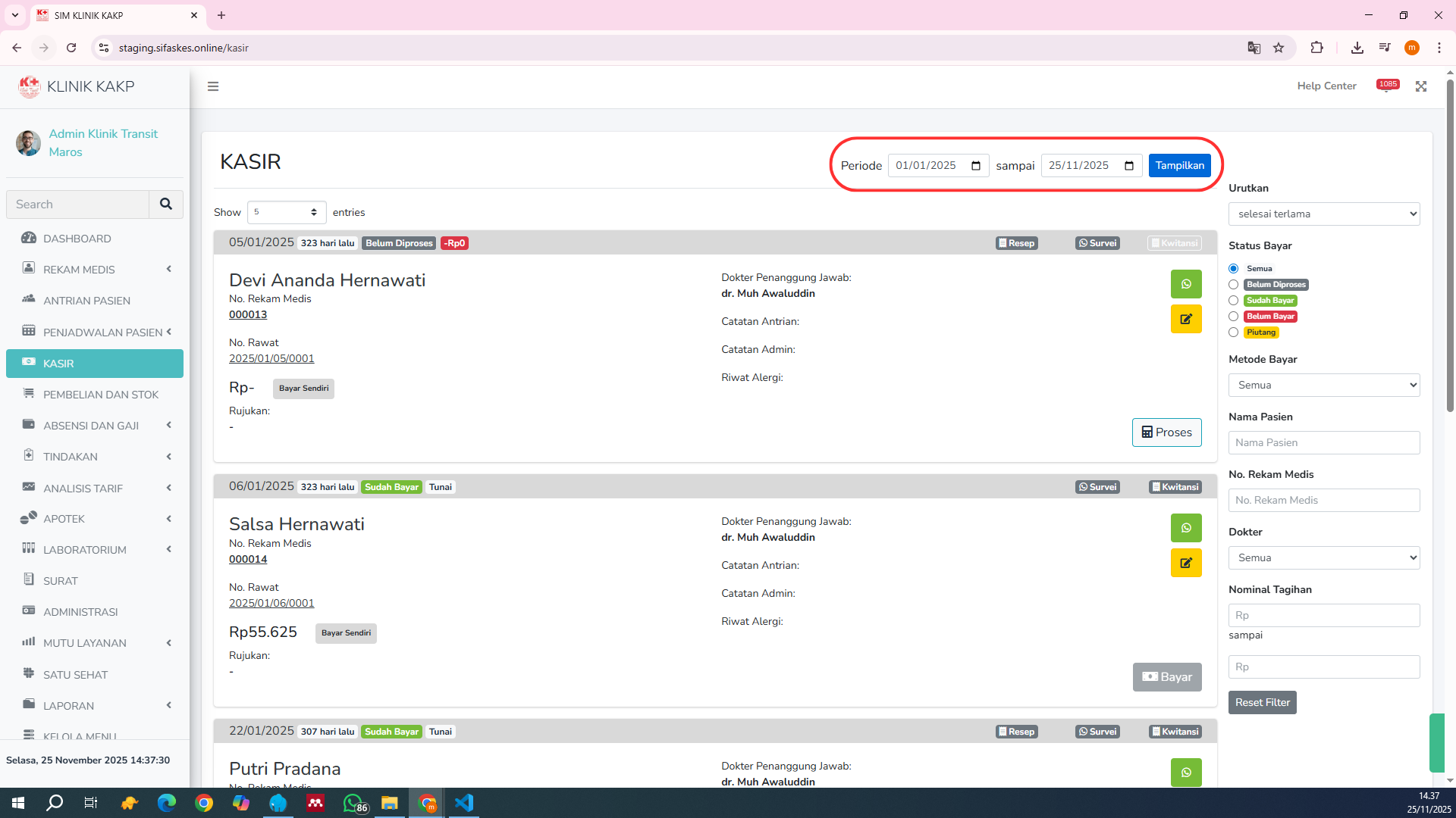 Temukan dan klik tombol Bayar pada data pasien yang dipilih