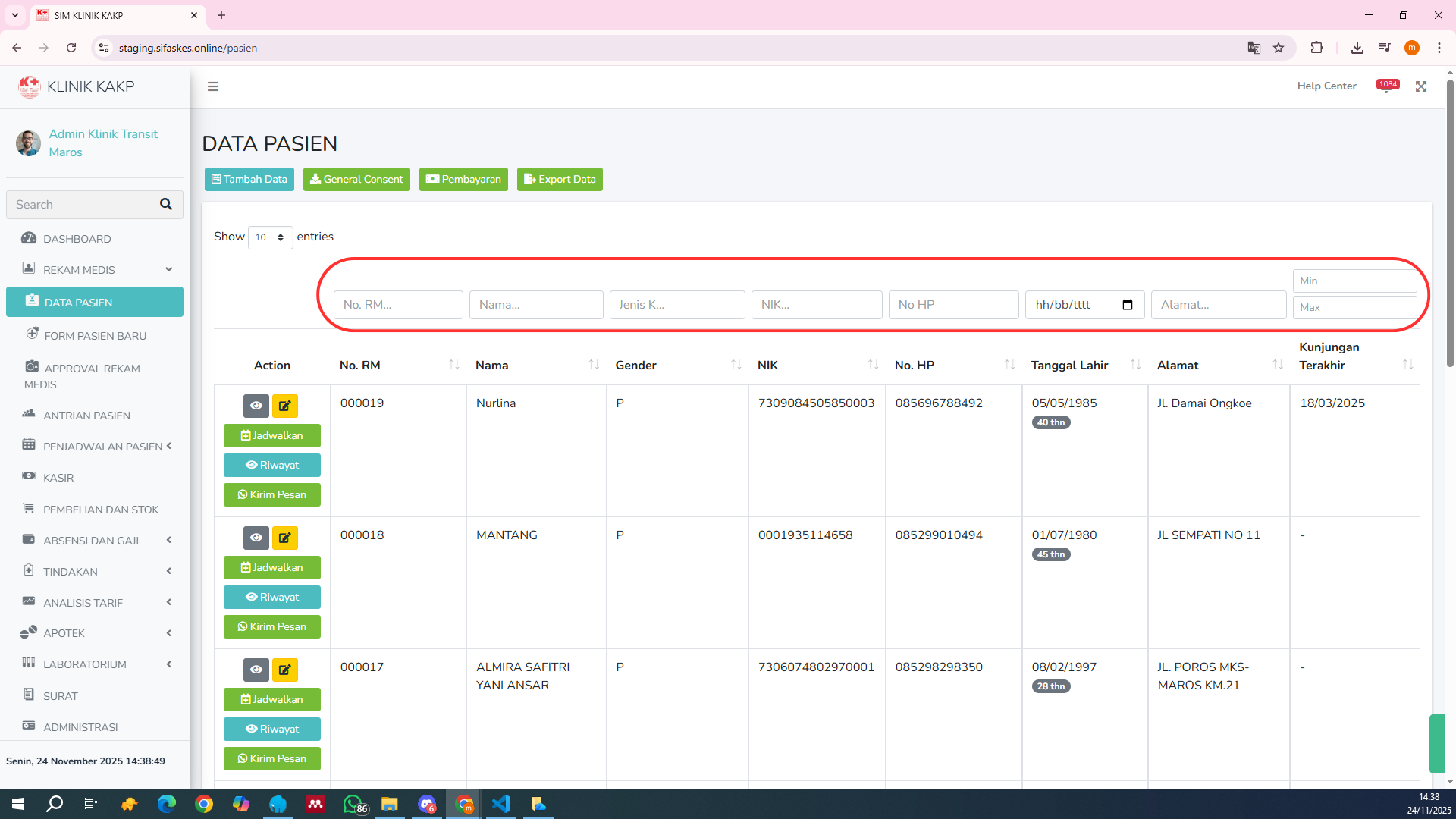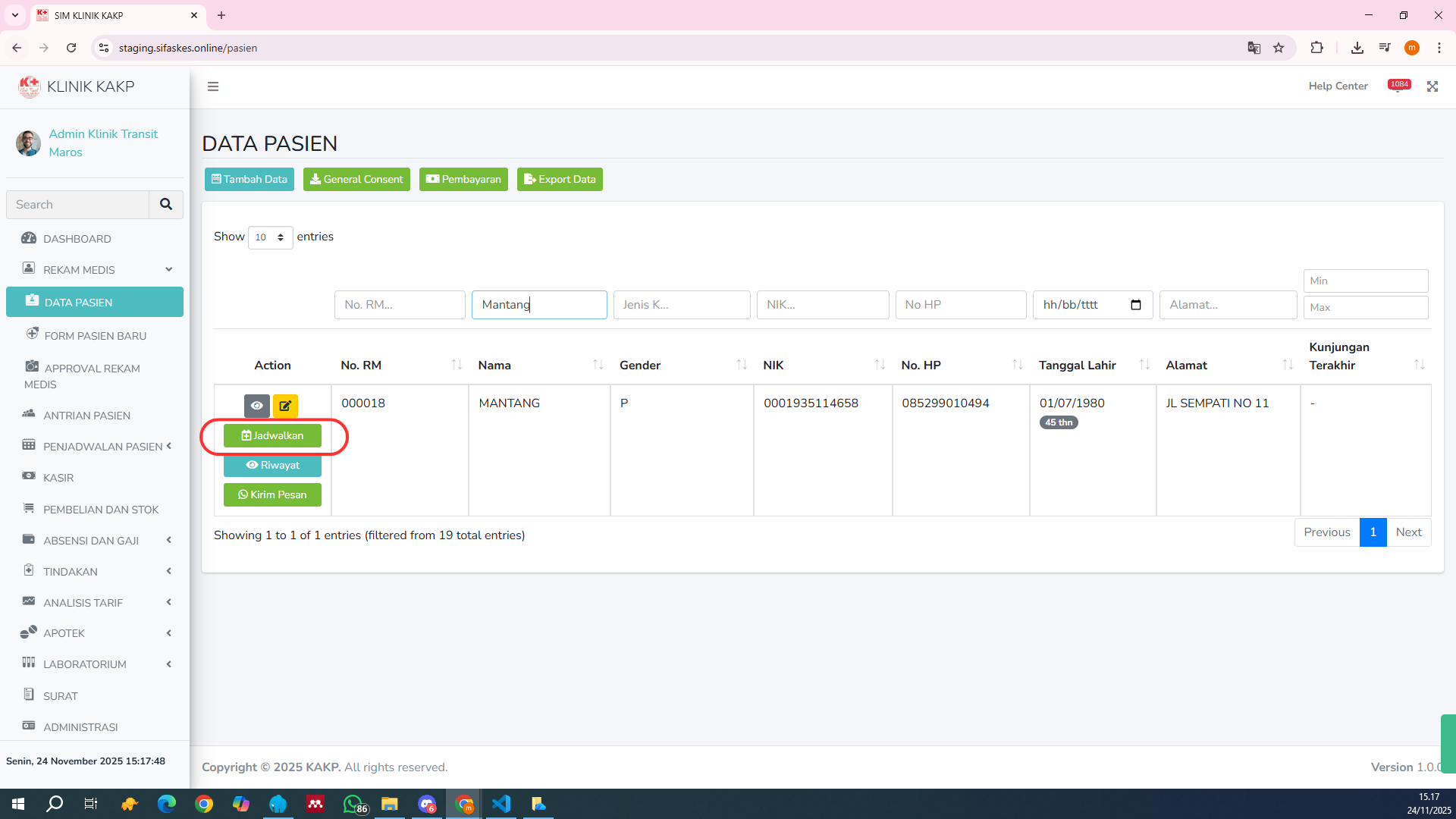 Temukan dan klik tombol Jadwalkan pada data pasien yang dipilih