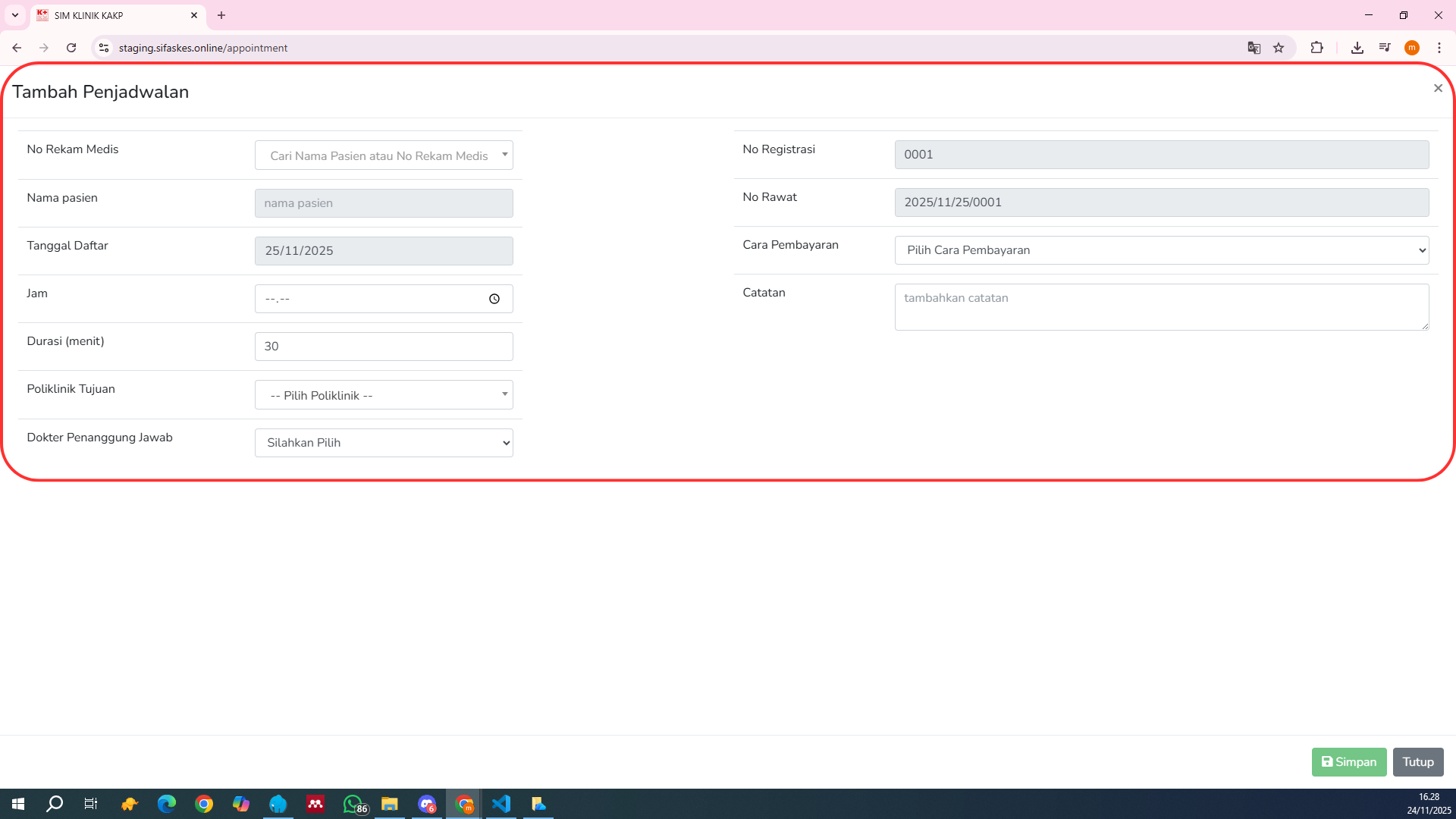 Lengkapi data sesuai kebutuhan seperti nomor rekam medis, nama pasien, jam kunjungan, poliklinik, dokter, dll.
