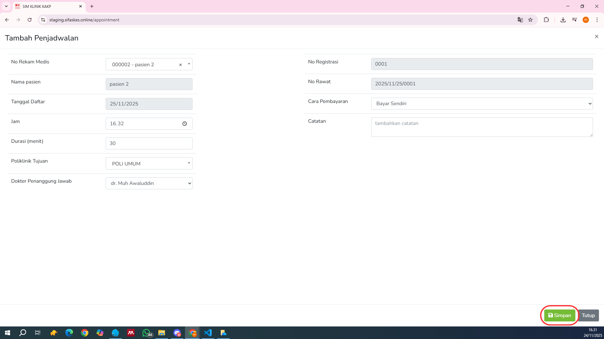 Setelah semua data diisi, klik tombol Simpan untuk menyimpan jadwal kunjungan